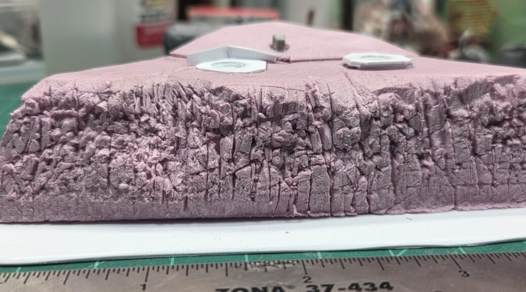 The 1/1200 shore battery has had it’s pair of guns installed. They’re tiny bits of plastic broom bristle installed with superglue and very fine tweezers. Measuring the gun pits and bunkers, the whole thing is probably slightly underscale for 1/1200 (the gun pits are about 1/4″ across, they should probably be more like 1/3″ across) but it all works as an edge-of-table representation of a shore battery!