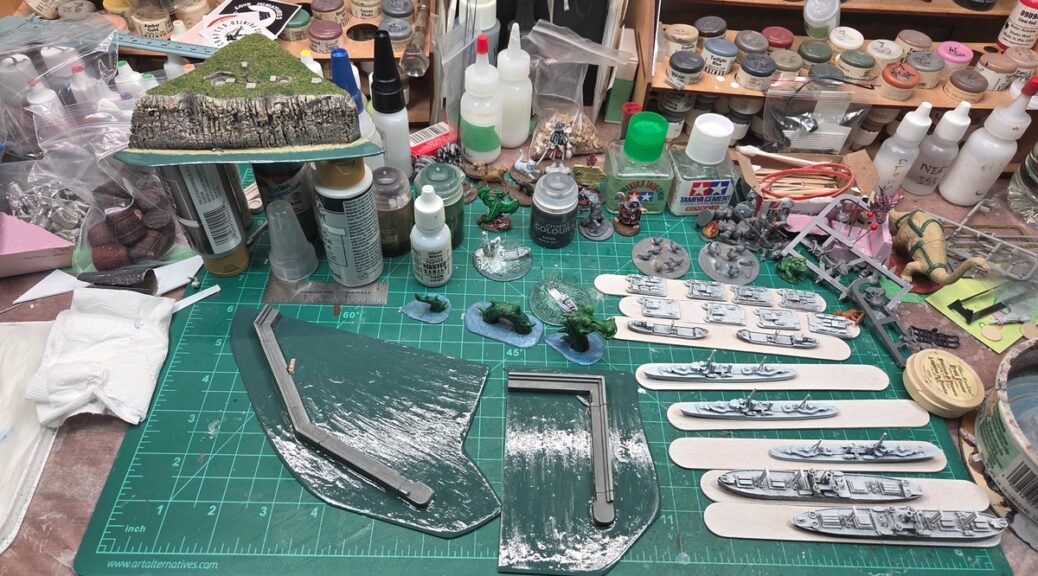 On the actual workbench, some of the 1/1200 3d resin printed vessels mentioned a post or two ago, and a fun pair of halfling pony cavalry from Wargames Atlantic. The chap on the left is intended for Harfoot Jousting mostly and is built straight from the WA halfling cav sprue; the trooper on the right is converted with Warlord Games 17th C pistols and such to be a halfling pistoleer medium cavalry chap.